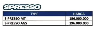 Berikut daftar harga mobil Suzuki Spresso yang berlaku di bulan ini. Harga Suzuki Spresso ini merupakan OTR Surabaya. Untuk informasi promo dan pemesanan mobil Suzuki Spresso, hubungi :